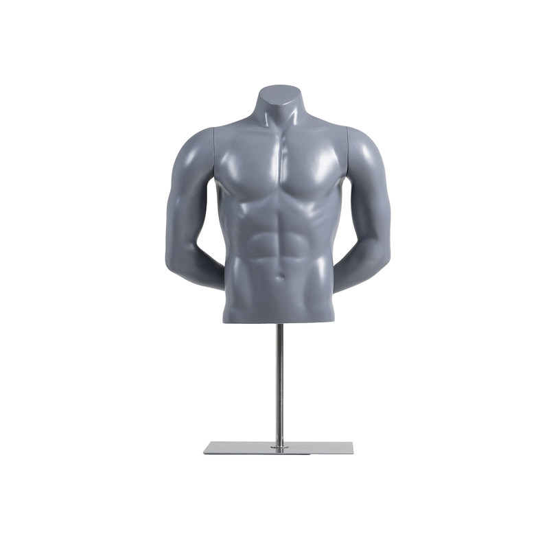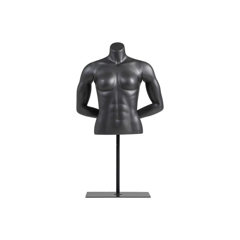 Model ini menggunakan bahan serat kaca matte hitam, menampilkan perasaan modern dan high-end. Desain setengah tubuh membuatnya lebih cocok untuk menampilkan kategori pakaian seperti atas, jaket,dan aksesoris. Desain tanpa kepala memungkinkan orang untuk lebih fokus pada menampilkan detail pakaian, membawa lebih banyak perhatian pada produk atau merek Anda.