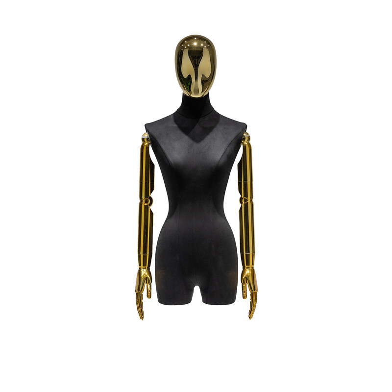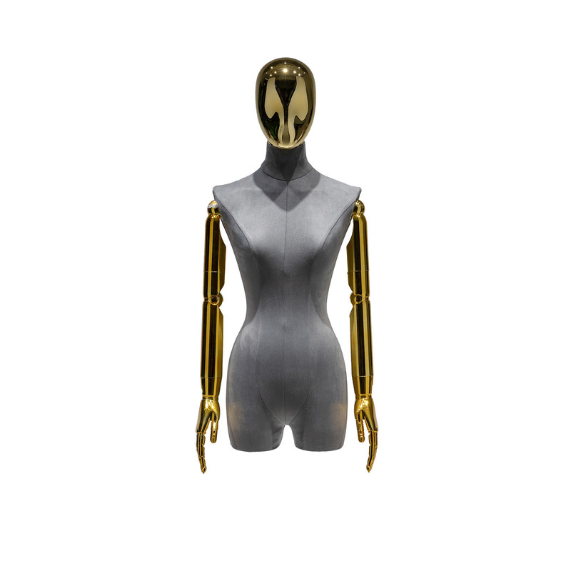 Manekin wanita ini bukan hanya alat tampilan, tetapi juga simbol seni dan tampilan mode.Lengan berlapis emas mewakili kepribadian dan selera yang unik, sementara setengah penutup tubuh menciptakan suasana misterius dan indah.Ini akan membawa rasa keanggunan dan kemewahan ke area pameran Anda, menciptakan pengalaman belanja yang unik bagi pelanggan.
